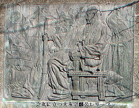 ![]() 宗麟候レリーフと国崩(くにくずし)の大砲(復元品) 天正4年(1576年)ポルトガル人より宗麟候に佛狼機(フランキ)砲が贈られたが、これが日本初の大砲と云われている。宗麟候は、これを「国崩」と命名し、臼杵城の備砲として備えつけた。 |