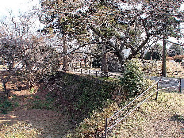 ![]() 卯寅口門脇櫓から見た崖上の本丸(建物はトイレ) 崖の右上は亀首(かめのくび)櫓跡、その下は卯寅口。 |