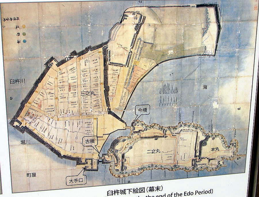 ■臼杵城絵図 ![]() 本丸、二之丸の周囲は海で、三之曲輪とは今橋と古橋の二つの橋で繋がっていた。本丸は島の突端に造られ、本丸の右下(西北隅)には3層4重の天守櫓があった。 |