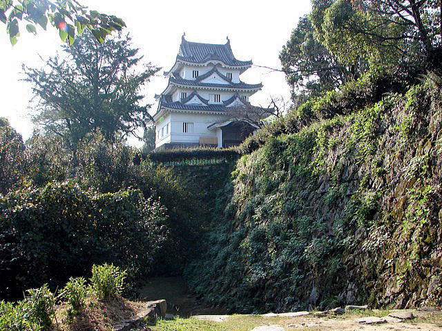 《二の丸より三重三階の天守を望む》![]() かっては城の二辺(西と北)が海に面する不等辺五角形の縄張の海城であった |