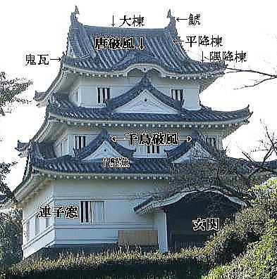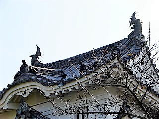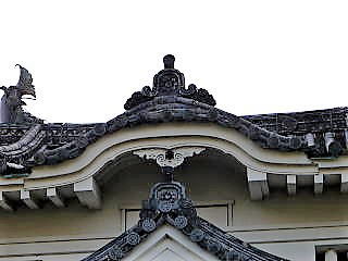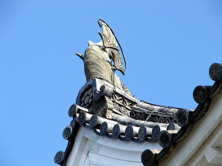 鯱(しゃち) ![]() 宇和島城の鯱は瓦製。中は空洞になっている。頭が虎で、胴体が魚、この想像上の霊魚を鯱という。天守の屋根の頂に上げて飾る。天守以外でも、重要な隅櫓、櫓門などにも使う。 |