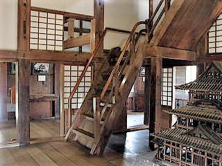 寛文6年(1666)に再建された二代目天守。三重三階本瓦葺、白壁総塗籠の層塔型天守。唐破風造の玄関は、天守に威厳を添える。一重目に比翼千鳥破風、二重目に千鳥破風、三重目に軒唐破風と装飾性に富んだ天守となっている。宇和島城天守の構成形式は、天守だけが単独に建つ独立式天守。 ![]() 天守雛形 |