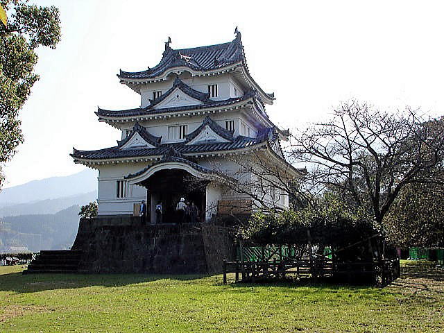 | [宇和島城沿革] ここに初めて築城された年代は明らかではないが、天慶4年(941)橘遠保が宇和地方の豪族となり、嘉禎2年(1236)には、西園寺公経の所領となり、戦国時代天文15年(1546)家藤監物の居城となって、板島丸串城(いたじままるぐしじょう。板島は宇和島の旧名)といわれていた。天正3年(1575)には、西園寺宣久が居城とし、天正13年(1585)小早川隆景の所領となり、天正15年(1587)には戸田勝隆の領するところとなった。 現在の地に初めて天守が建造されたのは慶長6年(1601)ごろ藤堂高虎によってであるといわれている。文禄4年(1595)藤堂高虎が宇和郡7万石に封ぜられるに及んで初めて本城となり、慶長元年(1596)築城工事を起こし慶長6年(1608)ごろまでかかって、城堀をほり石垣を築き、天守以下大小の矢倉を建て、厳然たる城郭を造った。慶長13年(1608)高虎が今治に転封となり同年富田信濃守信高が入城したが、まもなく改易となり、約1年間幕府の直轄地となった。 慶長19年(1614)には奥州仙台の藩主、伊達政宗の長子秀宗が、宇和郡10万石を賜り元和元年(1615)に入城し、それ以後伊達氏歴代の居城となった。二代宗利の時、寛文4年(1664)から天守以下城郭の大修理を行い、同11年(1671)に至って完成した。その後たびたび小修理が行われているが、現在の天守は寛文の時代に完成した姿をそのままに残しているものである。廃藩後、周囲の矢倉は大部分取りのけられ、昭和20年の戦災で追手門(国宝)を焼失したので今はわずかに天守と上(のぼ)り立ち門を残すのみである。 |