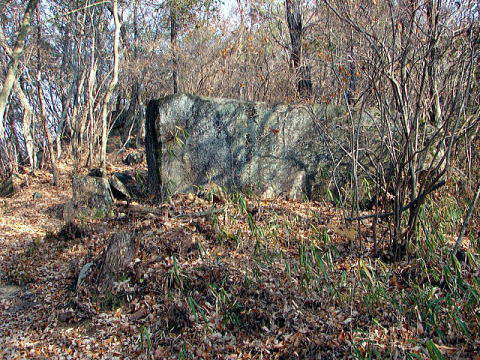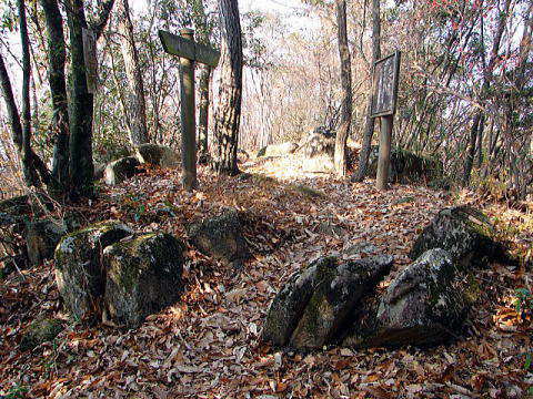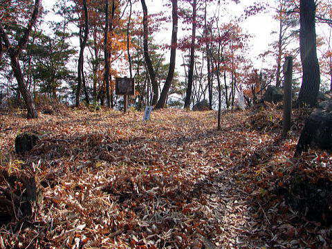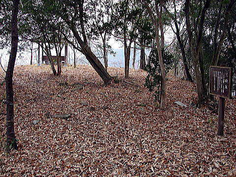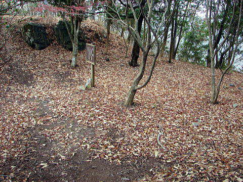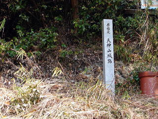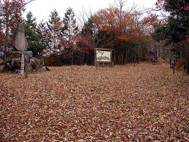 ▼石碑の建つ本丸跡〜天神山城(連郭式山城)の中心部で戦の場合城主の本陣となる。