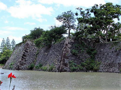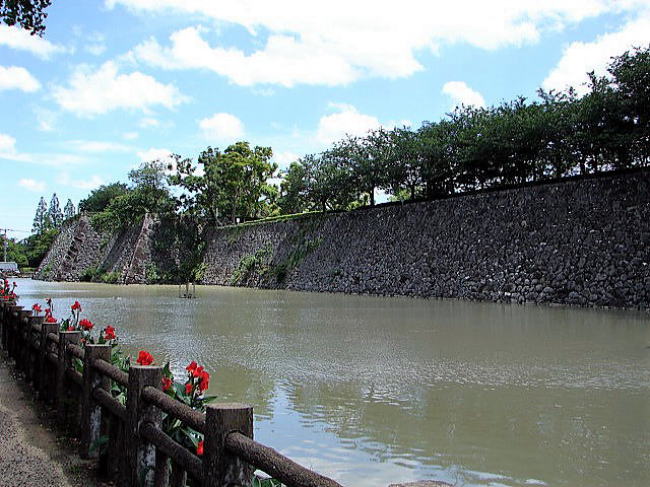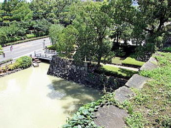 八代城本丸西辺の石垣と内堀 左端の出隅は大天守台、その右は小天守台、右端角には月見櫓跡が位置する |