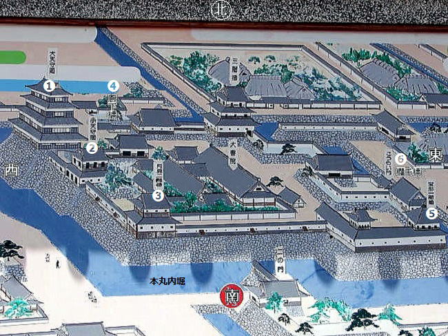 ![]() 本丸北辺の廊下橋 右の石垣は大天守台。 |