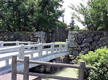 ![]() 本丸東辺と欄干橋 手前の石垣上は宝形櫓跡、奥の突出ている石垣は磨(みがき)櫓跡。欄干橋を渡ったところが高麗門跡。 |