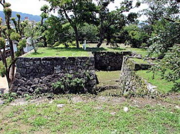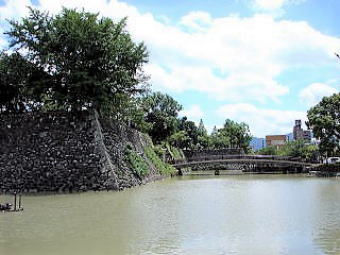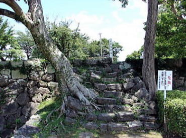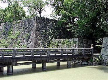 ![]() 本丸南辺の様子 手前石垣上は月見櫓跡。橋は明治時代に本丸に八代宮の社殿が建立された時に造られた神橋 |