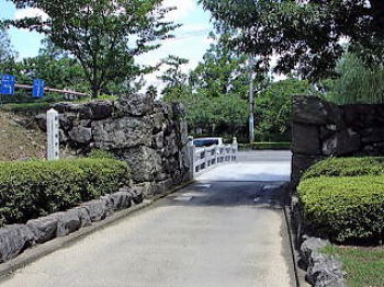 写真上(左・右) 欄干橋跡と高麗門跡。高麗門は「欄干橋門」とも呼ばれ、八代城本丸の正門に当る表枡形門の「一の門」になり、高麗門を通り抜け、鍵の手に曲がった所に「二の門」である頬当門がある。これは外部からの敵が直進して城内に入るのを防ぐために造られた。 欄干橋は木造の太鼓橋であったが、現在はコンクリート製の橋が架けられている。 写真左 城内から見た高麗門跡と欄干橋。 |