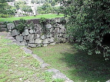 ![]() 小天守台 本丸南西隅の月見櫓跡から見た北西隅の小天守台。芝生の上には長塀が小天守まで続いていた。 |