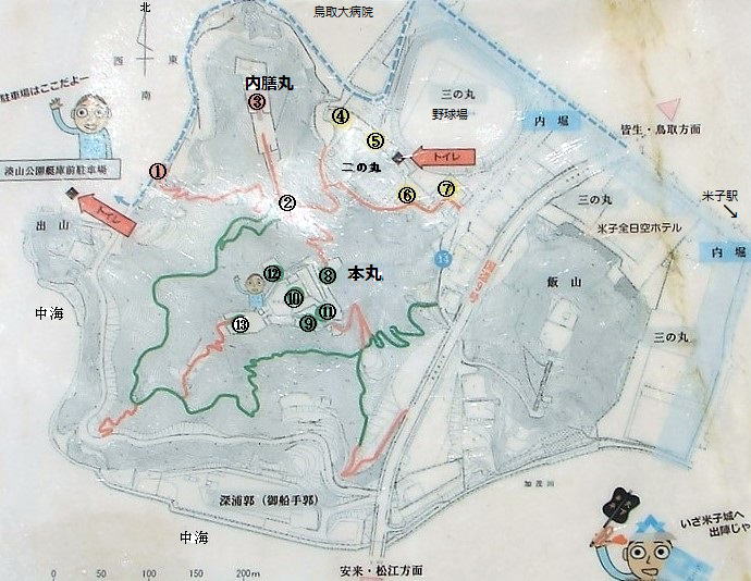 【米子城跡案内図】 ①鈴門(すんずもん)②登り石垣 ③内膳丸(ないぜんまる) ④裏御門跡 ⑤二の丸跡 ⑥旧小原家長屋門 ⑦枡形(ますがた) ⑧番所跡 ⑨鉄御門跡(くろがねごもんあと) ⑩天守跡 ⑪四重櫓跡(しじゅうやぐらあと) ⑫遠見櫓跡(とおみやぐらあと) ⑬水手御門跡(みずのてごもんあと) |