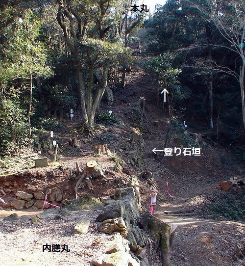 ![]() 本丸遠見櫓側から見た登り石垣 中央の樹木が竪に伐採されている所に残る。 |