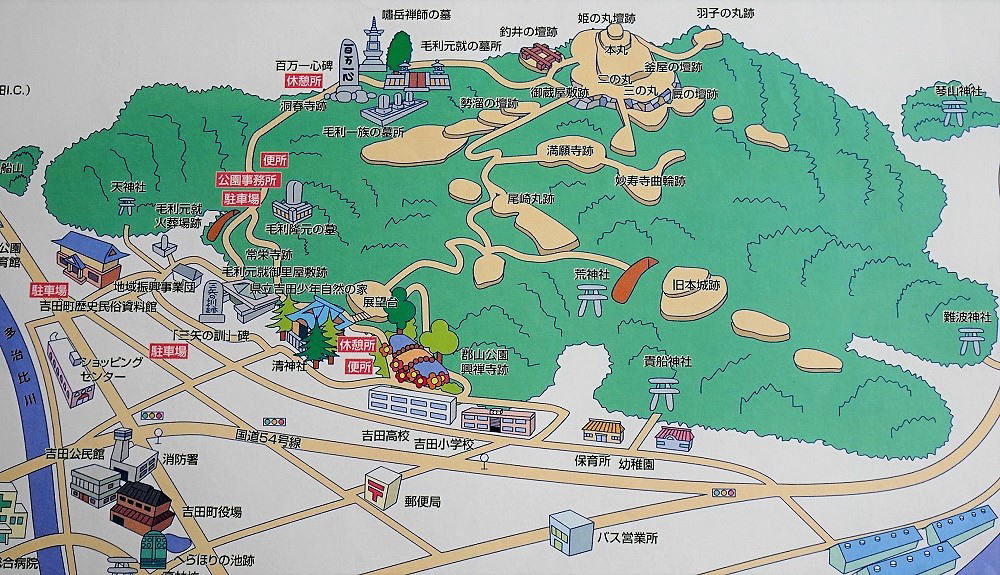 ![]() 吉田町歴史民族資料館(現・安芸高田市歴史民俗博物館) 博物館では毛利氏の歴史や郡山城の説明などを展示・紹介。郡山城跡へは、博物館右側の整備された道を登って行きます。 博物館から墓所参道入口に行くまでに、吉田少年自然の家(平成29年3月末にて施設廃止)、「元就の火葬場跡」などがあります。 |