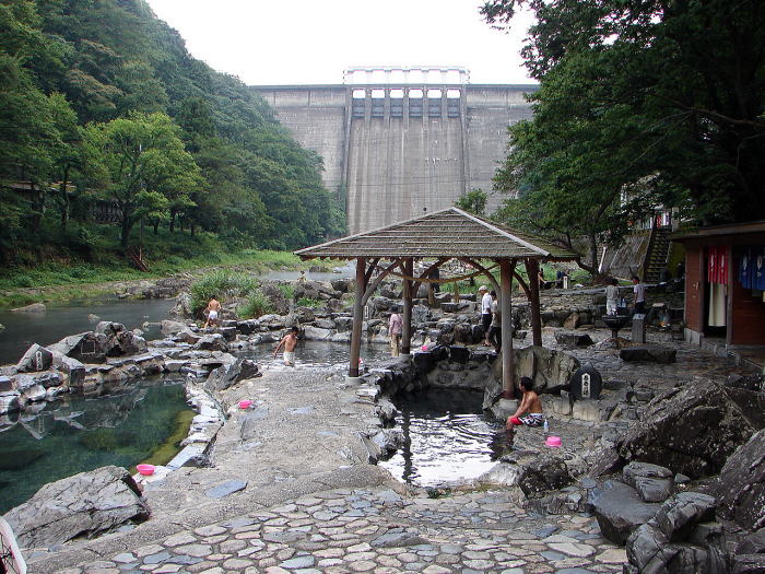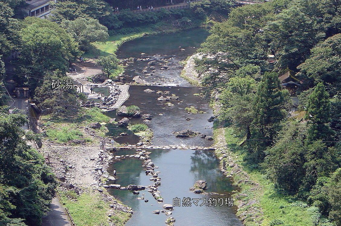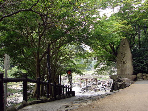 全国露天風呂番付で西の横綱に選ばれた天然露天風呂「砂湯」。川底の砂を噴き上げながらお湯が沸いている事から「砂湯」あるいは「砂噴き湯」と呼ばれ、地元民が管理して年中無休、無料で開放されている。