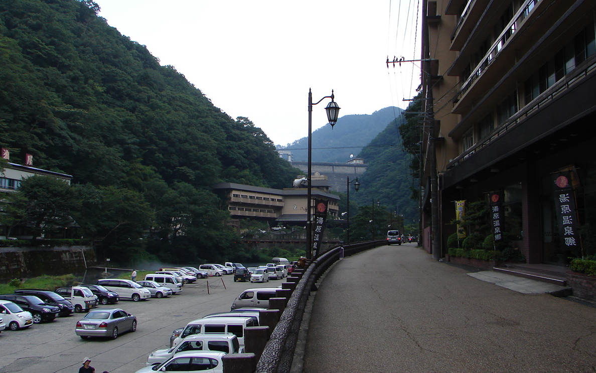 ![]() 湯原温泉街 前方奥に見える堰堤は湯原ダムで、砂湯があるところ。 |