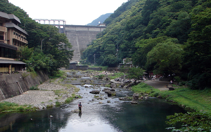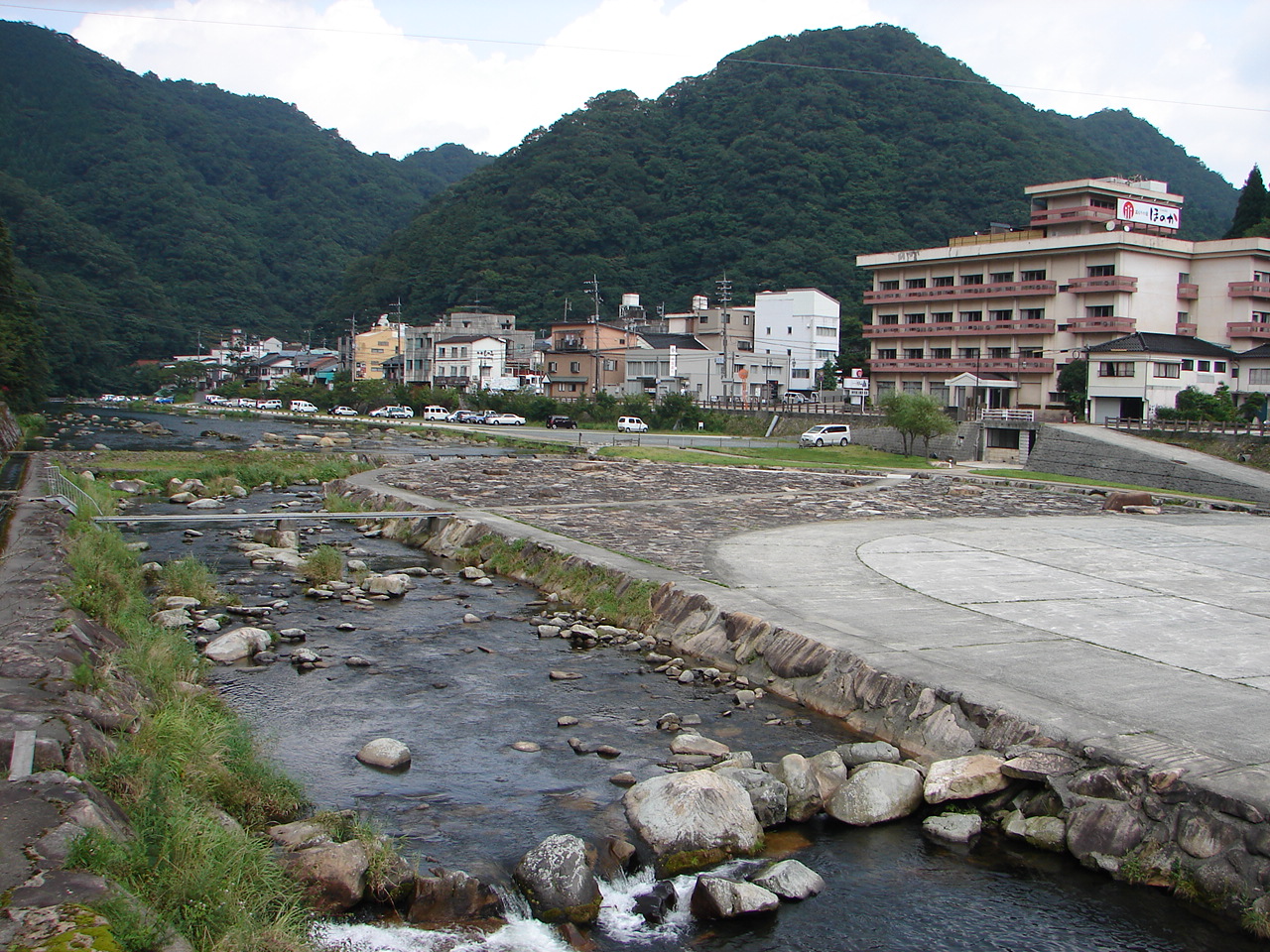 ![]() 湯原温泉街(湯原大橋から) 山側が上流。ここから山側に向かって、手湯、手湯・足湯、砂湯、湯原ダムなどがある。 |