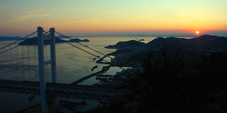 ■鷲羽山山頂からの眺め〜小島が点在する瀬戸内海の自然美と瀬戸大橋という人工美が調和した景色を、刻一刻と茜色に染めていく夕暮れどき。