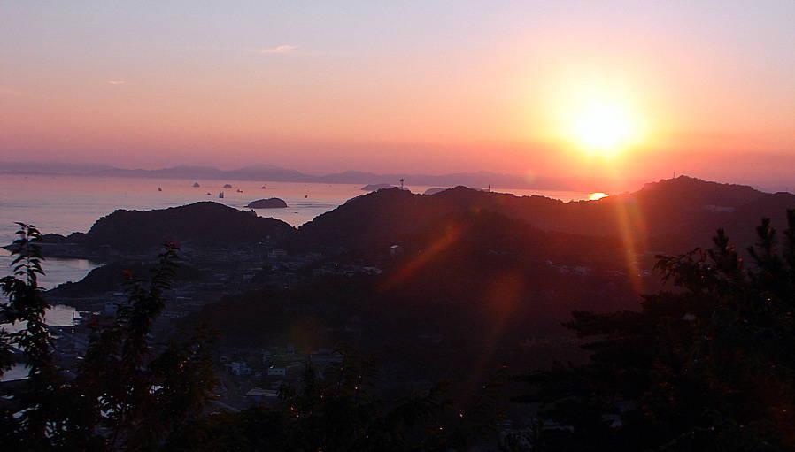 ここから望む夕陽が百選に選ばれている。左下の町並みは下津井港。