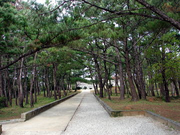 この石段を上がると、写真の松林が生い茂る道が続き、奥に郭跡が位置する。